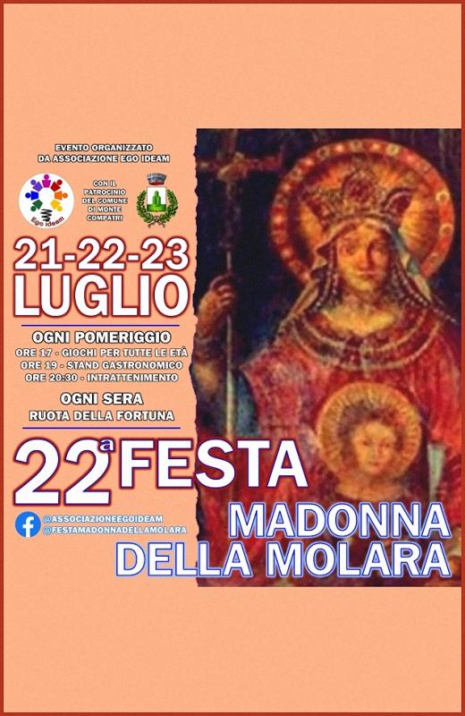 Da Venerdì 21 a Domenica 23 Luglio torna la “Festa della Madonna della Molara”, giunta alla 22esima edizione, organizzata dall’Associazione Ego Ideam - Ex Insieme per Molara con il patrocinio del comune di Monte Compatri. Ogni pomeriggio sono previsti giochi per tutte le età, stand gastronomico e intrattenimento a partire dalle ore 20.30.