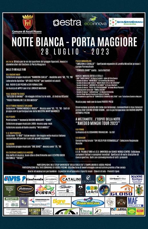 Venerdì 28 Luglio 2023 si terrà la "Notte Bianca di Porta Maggiore" ad Ascoli Piceno, una serata ricca di eventi. Spettacoli, giochi ed animazioni per bambini, espositori di artigianato, cibo di strada, prodotti tipici e tanto altro.