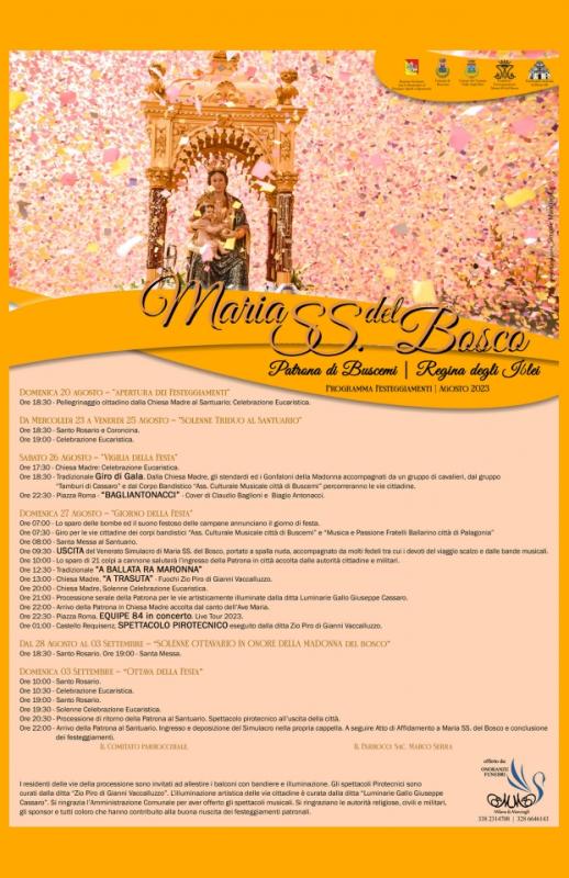 A Buscemi in provincia di Siracusa si svolgono nei giorni dal 20 Agosto al 03 Settembre 2023 i Festeggiamenti in Onore di Maria SS. del Bosco, Patrona di Buscemi.