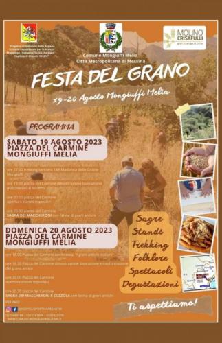 A Mongiuffi Melia in provincia di Messina si svolge nei giorni 19 e 20 Agosto 2023 la Festa del Grano con la Sagra dei Maccheroni al ferretto di grani antichi siciliani, Sagra della Cuzzola fritta e formaggio, Stands prodotti tipici e degustazioni, Spettacoli, Trekking e tanto altro.