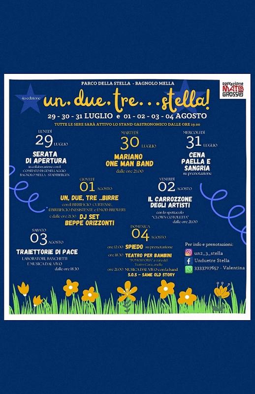 Presso il Parco della Stella a Bagnolo Mella in provincia di Brescia si svolge nei giorni dal 29 Luglio al 04 Agosto 2024 la Festa "Un, Due, Tre...Stella".