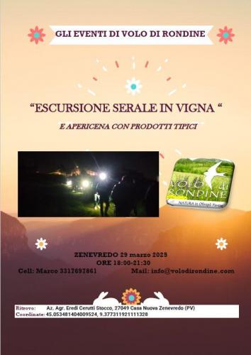 - ore 18:00 ritrovo presso l'azienda Agricola Eredi Cerutti Stocco, registazione, e inizio escursione accompagnati dal naturalista dott. Marco Ciccolella, guida di Volo di Rondine. Durante la passeggiata, in notturna, ci si dedicherà all'osservazione di flora, tracce di fauna sia nelle vigne che in un particolare ambiente selvatico con presenza di uno stagno.