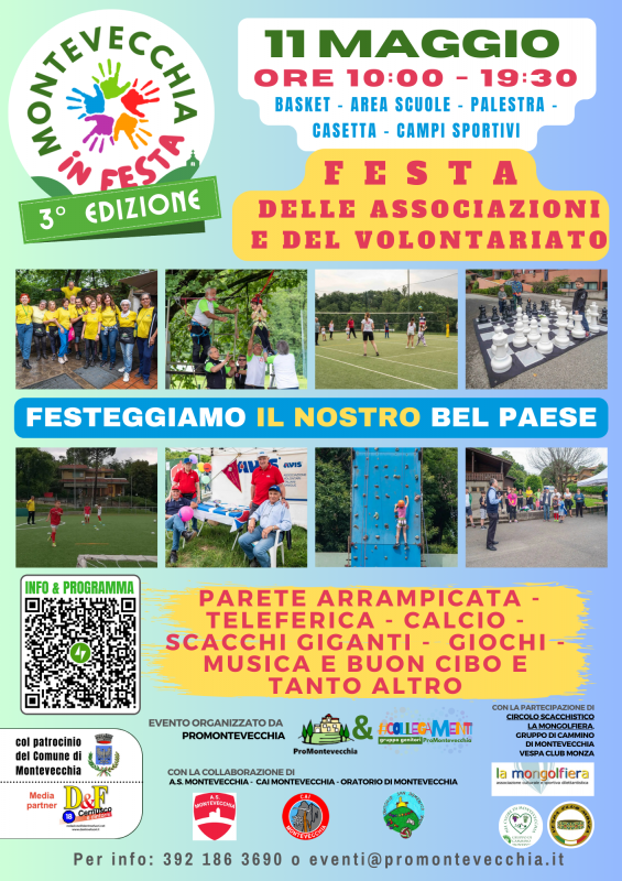 Siamo lieti ad invitarvi alla terza edizione di Montevecchia in Festa, la giornata di festa dedicata alle associazioni e del volontariato, dove le associazioni ProMontevecchia, AS Montevecchia, CAI Montevecchia e Oratorio di Montevecchia organizzano una giornata di sport e attività all'aperto tutto questo accompagnato da buon cibo e tanta musica.