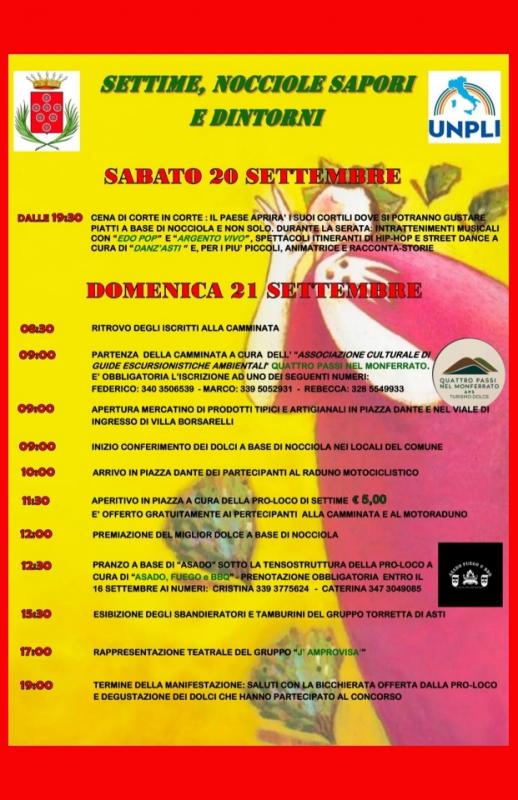 Domenica 21 settembre dalle ore 9,00 mercatino di prodotti artigianali, passeggiata con l'associazione "Quattro passi nel Monferrato", motoraduno, aperitivo in piazza, pranzo a cura di "Asado Fuego e Bbq", esibizione dei tamburini e degli sbandieratori del rione Torretta, spettacolo teatrale del gruppo "J'Amprovisà" e bicchierata finale.