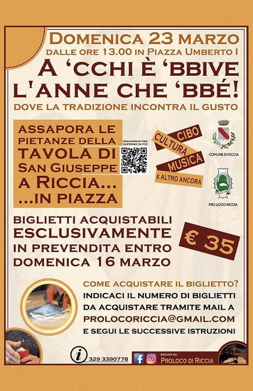 NB L'obiettivo unico della manifestazione è quello di promuovere la tradizione della devozione verso San Giuseppe a Riccia, cosa che la presente Associazione cerca di fare da anni, tramite l'aspetto gastronomico. Pertanto, NON verrà in alcun modo simulata la Sacralità della Tavola, che tantissime famiglie "privatamente" attuano, ma semplicemente si darà l'opportunità di degustare i singoli piatti (da 13 a 19 pietanze), che solitamente si realizzano in questa occasione, prodotti da alcuni ristoratori riccesi e che poi saranno messi a disposizione in opportuni stand dei partecipanti, che decideranno in autonomia cosa assaporare.