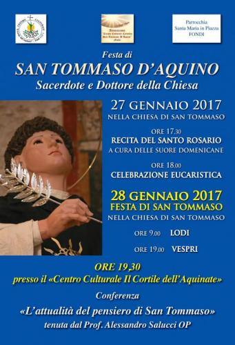 Venerdì 27 Gennaio presso la chiesa di San Tommaso d’Aquino, nel complesso di San Domenico a Fondi, alle ore 17:30 il Rosario e alle ore 18:00 la Messa. Sabato 28 Gennaio, giorno della Festa di San Tommaso d’Aquino, alle ore 9:00 le Lodi mattutine e alle ore 19:00 i Vespri.