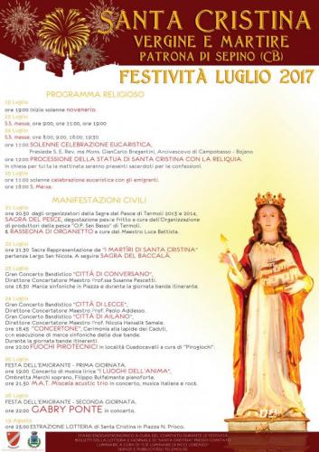Gli eventi per la Festa di Santa Cristina, Patrona di Sepino, si svolgono dal 15 luglio al 19 agosto 2017, tra momenti religiosi e di raccoglimento e mannifestazioni civili di grande attrattiva come la Sagra del Pesce, la Sagra del Baccalà, i fuochi pirotecnici o la serata di musica con Gabry Ponte.