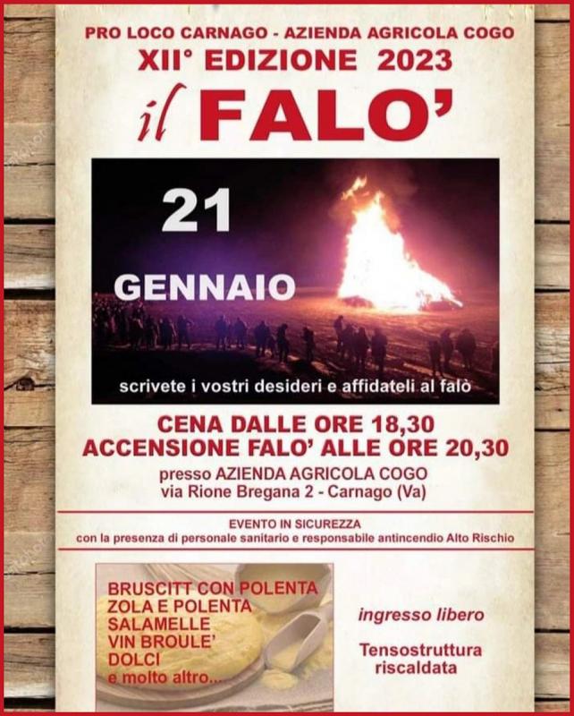 Nuovo anno e antiche tradizioni che si rinnovano come il Falò di S. Antonio Abate giunto alla 14a edizione. Sabato 18 Gennaio venite alla Fattoria Cogo di Carnago a scaldarvi con una gustosa trippa o una fumante polenta, accompagnate da un buon bicchiere di vin broulè e non dimenticate di esprimere il vostro desiderio. Ingresso libero a tutti.