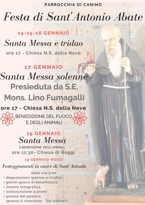 Il Comitato Festeggiamenti di Sant'Antonio Abate "Roggi", in collaborazione con la Pro Loco di Canino, il Comune presenta i festeggiamenti di Sant'Antonio Abate in località Roggi con eventi e liturgie dal 14 al 19 gennaio 2020.