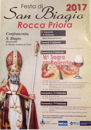 Nell' incantevole scenario del paese di Rocca Priora, il più alto dei castelli romani è tutto pronto per la sagra della polenta, anche quest' anno preparata dalle sapienti mani delle donne del paese. Inoltre, intrattenimento musicale e spettacoli per bambini, il tutto offerto dalla confraternita di San Biagio. A conclusione della manifestazione grande spettacolo pirotecnico. La manifestazione avrà luogo dalla mattina al tramonto.