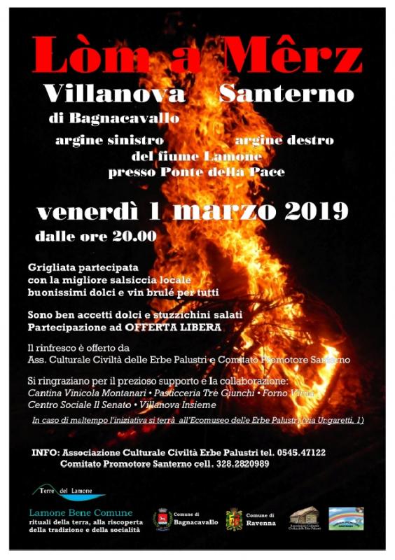 L'atteso appuntamento di venerdì 1 marzo a Villanova di Bagnacavallo e Santerno, non si farà scoraggire dal maltempo. Per ragioni di sicurezza non avverrà sul argine del Lamone, bensì presso Etnoparco Villanova delle Capanne, corte dell'Ecomuseo delle Erbe Palustri, in via Ungaretti 1 a Villanova di Bagnacavallo. Non mancherà il tradizionale falò e nemmeno la grande grigliata partecipata con la miglior salsiccia locale, unitamente a dolci e vin brulé. L'evento potra svolgersi con tuttte le condizioni climatiche, l'etnoparco, illuminato a festa, è attrezzato con un ampio loggiato coperto e il capanno maggiore ospiterà un ricchissimo buffet di stuzzichi salati e di dolci tipici locali. Alle ore 20,00 è prevista l'accensione del fuoco che darà inizio al conviviale incontro rivolto a tutti, con una accoglienza rustica e cordiale offerta dall'Associazione Culturale Civiltà delle Erbe Palustri e dal Comitato Promotore Santerno