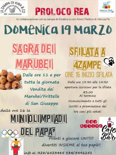 Domenica 19 Marzo torna uno degli appuntamenti classici di Rea: in piazza Busoni, dalle ore 11, si svolgerà la Festa dei Marubei, le caratteristiche frittelle preparate per il giorno di San Giuseppe. Si tratta di dolci poveri, fatti con acqua e farina e cotte nello strutto. In programma anche animazione per i bambini. La giornata è organizzata dalla Pro Loco.