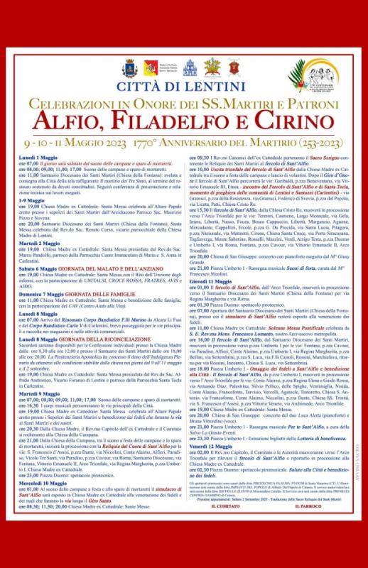 A Lentini in provincia di Siracusa si svolgono nei giorni dal 09 al 11 Maggio 2023 le Celebrazioni in Onore dei SS. Martiri e Patroni Alfio, Filadelfo e Cirino.