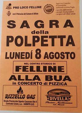 La 19° Sagra dell Polpetta di Felline si svolte lunedì 8 agosto 2016. Ad allietare la serata la pizzica dei Tammurria.