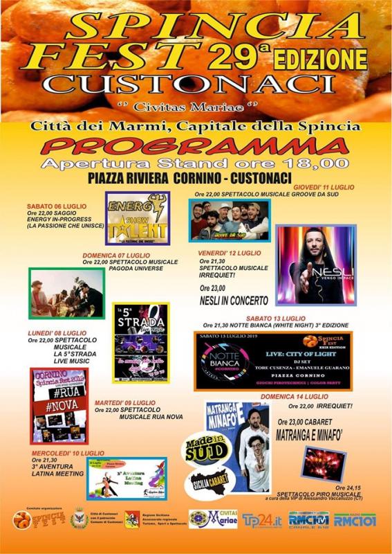 Dal 06 al 14 Luglio torna il “Spincia Fest” a Custonaci. Un evento con protagonista indiscussa la «spincia», un dolce tipico ed inimitabile della provincia trapanese, realizzato con ingredienti semplici: farina, latte e patate. Il nome deriva infatti dalla radice della parola araba “isfang” che significa appunto frittella di pasta morbida e dolce che si frigge.