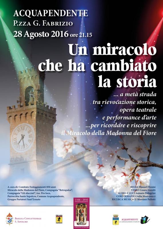 Il 28 agosto, in occasione della chiusura del 850° Anniversario del Miracolo della Madonna del Fiore e dei festeggiamenti in onore di S. Ermete, Patrono della città, il centro storico di Acquapendente si animerà al suono dei tamburi e delle chiarine, al passaggio degli splendidi costumi indossati da dame e cavalieri e al volteggiare delle bandiere colorate.