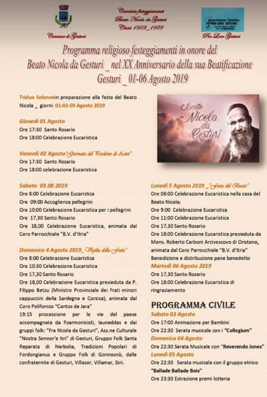 Il Comitato, il Comune di Gesturi, la Pro-Loco di Gesturi, il Gruppo Folk Fra Nicola e la parrocchia di S.Teresa d’Avila, dall'1 all'8 agosto, vi invitano ai festeggiamenti in onore del Beato Nicola da Gesturi.
