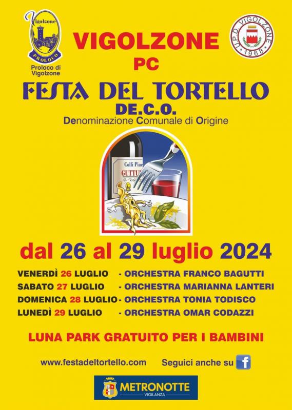 La Festa del Tortello De. Co. torna dal 26 al 29 luglio 2024 al Campo sportivo comunale di Vigolzone strada per Grazzano Visconti.