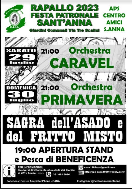 Il Centro Amici Sant'Anna - C.A.S.A. di Rapallo è lieto di annunciare che, nell’ambito dei festeggiamenti civili per la festa di Sant’Anna, anche quest'anno si svolgerà la SAGRA DELL'ASADO E DEL FRITTO MISTO DI PESCE.