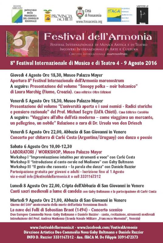 Il festival si terrà nei giorni 4, 5, 6, 8 e 9 Agosto 2016 a Fossacesia, con conferenze, workshop e concerti in programma che vengono offerti gratuitamente!