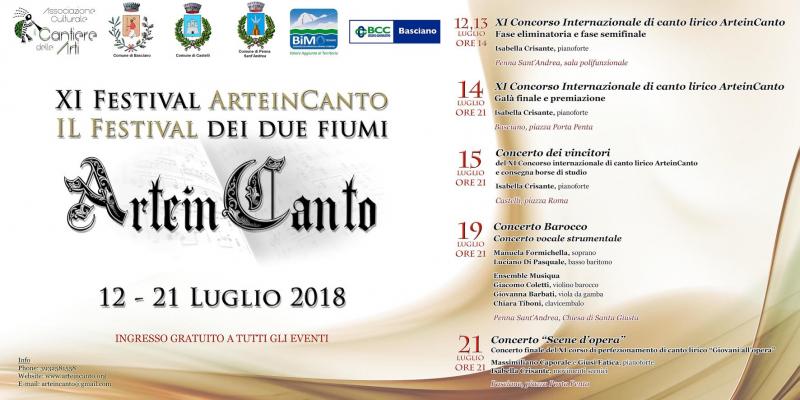 Giunto alla sua undicesima edizione, il Festival ArteinCanto, diretto dal M° Luciano Di Pasquale, e organizzato dall'Associazione culturale "Il Cantiere delle Arti", si terrà dal 12 al 21 luglio nei comuni di Basciano, Castelli e Penna Sant'Andrea. Ad aprire la Rassegna sarà il consueto Concorso internazionale di canto lirico ArteinCanto, anch'esso alla XI edizione, appuntamento diventato ormai tradizionale e che vedrà la partecipazione di cantanti provenienti da numerosi paesi europei ed extraeuropei. La competizione avrà luogo nella sala polifunzionale di Penna Sant'Andrea il 12 e 13 luglio e terminerà con il Gran Galà dei finalisti la sera del 14 luglio alle ore 21.00 in Piazza Porta Penta a Basciano. Una commissione di professionisti del settore valuterà i concorrenti ed assegnerà i quattro premi in denaro, ma sarà anche l'occasione in cui il pubblico potrà conferire un riconoscimento al proprio cantante preferito mediante apposita votazione. Il primo, il secondo e il terzo premio e il premio al miglior giovane saranno invece assegnati ai partecipanti più meritevoli dalla Giuria di esperti composta da: Manuela Formichella, soprano e docente di canto al conservatorio di Pescara, Isabella Crisante, pianista e consulente artistico dell'Istituto Tostiano di Ortona, Massimiliano Caporale, direttore d'orchestra, Luciano Di Pasquale, bass-baritone, docente di canto al conservatorio di Campobasso, e dal presidente di giuria il M° Massimiliano Becco Gagliardo, Artist Manager Athole Still Opera London. I cantanti premiati, accompagnati al pianoforte dal Maestro Isabella Crisante, si esibiranno nel Concerto dei vincitori il 15 luglio, alle ore 21, nella splendida cornice di piazza Roma a Castelli cantando alcune tra le più famose arie d'opera del proprio repertorio. Il 19 luglio, ore 21, nella Chiesa-auditorium di Santa Giusta di Penna Sant'Andrea, si esibiranno invece il soprano Manuela Formichella ed il basso baritono Luciano Di Pasquale, accompagnati dall' “Ensemble Musiqua” costituita dai musicisti Giacomo Coletti, violino barocco, Giovanna Barbati, viola da gamba, Chiara Tiboni, clavicembalo, in un ricercato Concerto Barocco.