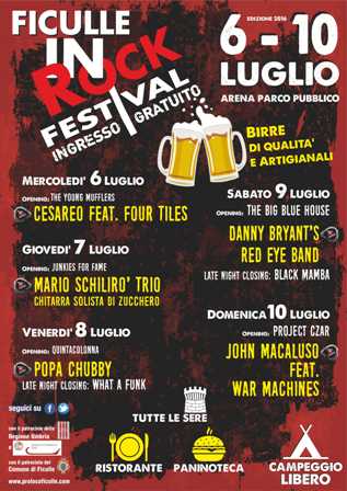 È partito il conto alla rovescia per ‘Ficulle in rock’, free festival musicale giunto alla sedicesima edizione che da mercoledì 6 a domenica 10 luglio sarà ospitato nella consueta location dell’arena Parco pubblico di Ficulle. Dodici concerti in cinque giorni, tra artisti di fama internazionale e band emergenti, che spazieranno tra rock, progressive rock, folk, jazz e blues. Organizzato dalla proloco di Ficulle, con il patrocinio di Regione Umbria, Comune di Ficulle e Camera di Commercio di Terni, l’evento è ormai una realtà consolidata nel panorama musicale umbro che cresce di anno in anno. Infatti, nella scorsa edizione ha registrato oltre 5mila presenze.