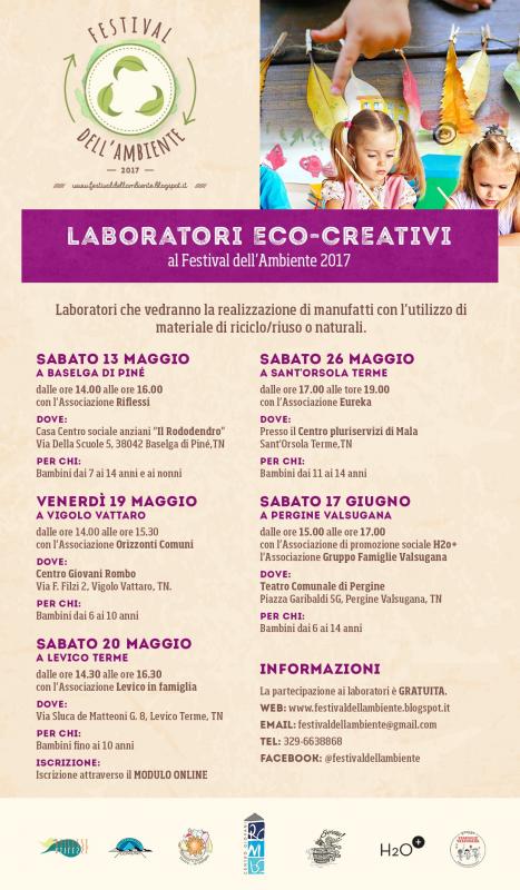 Anche per l'edizione 2017 il Festival dell'Ambiente organizza in vari comuni della Comunità di Valle Alta Valsugana e Bernstol i laboratori Eco-creativi, per coinvolgere attivamente i più giovani nella creazione di manufatti con materiali di riuso/riciclo o naturali, e sensibilizzarli così sul tema del riuso, del riciclo e del rispetto dell’ambiente anche nei gesti quotidiani.