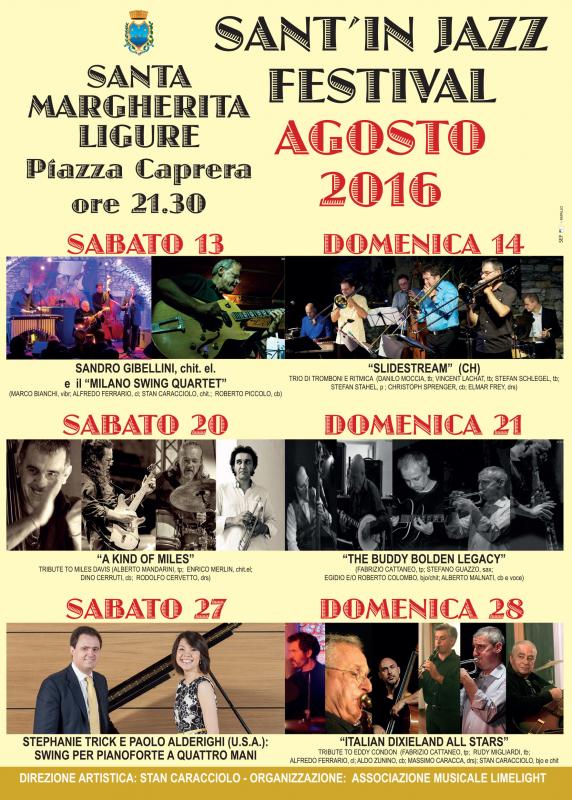 L’Amministrazione Comunale di Santa Margherita Ligure torna a dare spazio al Jazz: dopo il notevole successo ottenuto dalla bellissima edizione di Sant’in Jazz dello scorso anno e dopo le interessanti rassegne di giugno 2016 ( “Il golfo dei contrabbassisti” e i “Mercoledì del Jazz”, organizzati e diretti da Sara Antola e Rodolfo Cervetto), ecco annunciarsi nuovamente il “Sant’in Jazz Festival 2016”, dedicato al jazz classico (Dixieland e Swing) diretto anche quest’anno da Stan Caracciolo e organizzato dalla Associazione Musicale Limelight.