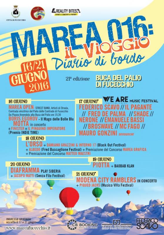 L'edizione 2016 del Marea Festival è dedicata al viaggio: “IL VIAGGIO: DIARIO DI BORDO” è il titolo dell’evento. Marea non è solo il festival, Marea è un motore che viaggia tutto l'anno, con svariate iniziative, tante quante sono le associazioni che del Comitato Marea fanno parte.