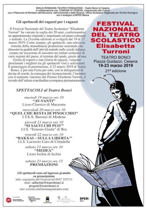 I 5 migliori spettacoli prodotti dalle Scuole Superiori italiane durante lo scorso anno scolastico arrivano a Cesena per sfidarsi sul palcoscenico del Teatro Bonci: è la ventunesima edizione del FESTIVAL NAZIONALE DEL TEATRO SCOLASTICO Elisabetta Turroni - in programma dal 19 al 23 marzo 2019 - che ogni anno seleziona, attraverso un bando pubblico a livello nazionale, i più interessanti progetti di teatro scolastico che coniugano qualità della messa in scena, coerenza del percorso formativo e riflessione sui temi della cultura giovanile. Di fronte al pubblico delle Scuole di Cesena e dintorni, sempre più competente e appassionato, vanno in scena 5 titoli scelti dalla Commissione selezionatrice tra le 31 domande di partecipazione.
