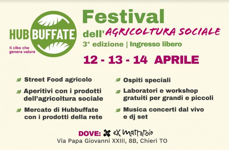 Venerdì 12, sabato 13 e domenica 14 aprile si svolgerà negli spazi del ristorante ExMattatoio di Chieri (TO) la 3° Edizione di Hubbuffate, festival dell’Agricoltura Sociale, che nasce con l’ambizione di dare visibilità alle aziende agricole che promuovono modelli di economia circolare e che si impegnano a dare lavoro alle persone più fragili.
