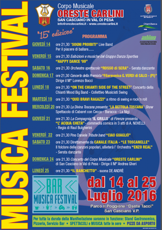 Dal 14 al 25 luglio 2016 si svolge a San Casciano in Val di Pesa il Musica Festival, ovvero la tradizionale manifestazione al parco Poggione organizzata dalla Banda Di S.Cascinao O. Carlini.