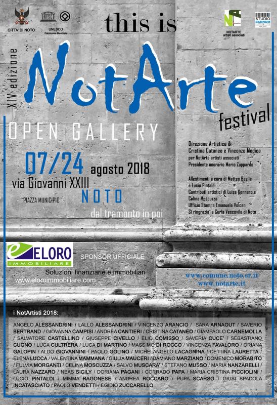 "NotArte è la festa degli artisti che dura 18 giorni - spiega Vincenzo Medica ideatore ed organizzatore dell'evento -.Con lo stesso entusiasmo della prima edizione ci prepariamo ad ospitare il genio creativo di 50 artisti che renderanno i circa 600 metri quadrati della via Giovanni XXIII la galleria a cielo aperto più attesa dell'estate con un percorso che si completa con la mostra degli astrattisti Abstracta al Museo Gagliardi e lo studio del Maestro Mario Zuppardo a Palazzo Astuto. L'itinerario prosegue nella scala che porta alla parte alta della città dove tra gli altri luoghi di particolare interesse storico-architettonico c'è l'ex Convento di Sant'Antonio dove si terrà anche quest'anno il Festival Internazionale di cinema breve "NIFF". La nostra Noto è una città piena di stimoli, per questo la nostra open gallery, anche se abbraccia un percorso univoco in salita, include una pluralità di stili e stati d'animo, di forme plastiche e pittoriche, di immagini e colori che compongono ogni sera, il grande tappeto visivo con tante e sorprendenti diramazioni. L'esposizione semplice su strada, crea un rapporto diretto con il pubblico, senza intermediazioni e senza limiti. Ringrazio l'Amministrazione Comunale per il Patrocinio e la Curia Vescovile per la disponibilità e la collaborazione logistica".