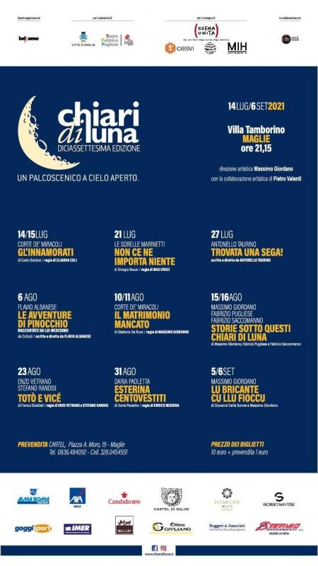 Presso Villa Tamborino a Maglie in provincia di Lecce si svolge nei giorni dal 14 Luglio al 06 Settembre 2021 la 17a edizione del Festival "Chiari di Luna".