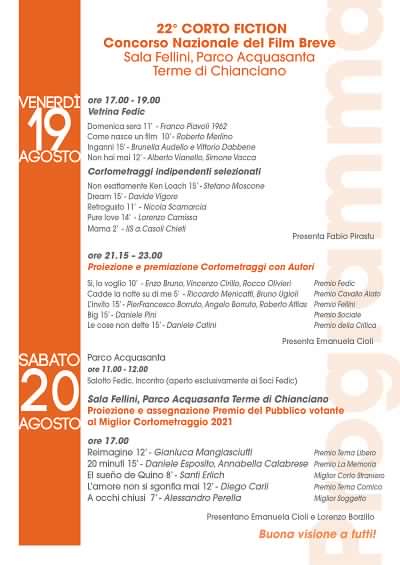 Tanti altri ancora sono i premi e che sarà il pubblico in Sala Fellini con la votazione a decretare il vincitore di questo 22° Corto Fiction Chianciano Terme. Il Festival ha il contributo del Comune di Chianciano Terme, Della Banca Centro Toscana Umbria, Terme di Chianciano, S.P.A, Ass. Federalberghi di Chianciano Terme, Micbat Fedic Nazionale
