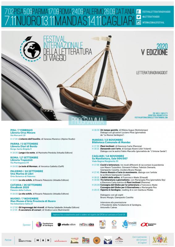 Il programma prevede, per la giornata del 12 novembre, gli incontri con Marisa Salebelle, che parlerà del suo romanzo “Gli ingranaggi dei ricordi”, con Vindice Lecis, che illustrerà il suo nuovo libro “Il cacciatore di corsari” e, infine, con Milena Agus, fresca di stampa con “Un tempo gentile”. Per la giornata del 13 novembre, appuntamento con Eleonora Carta, autrice di “Piani inclinati” e Paola Musa, con “La figlia di Shakespeare”. Per la giornata conclusiva, il 14 novembre, moderata da Bruno Murgia, appuntamento iniziale con il dibattito “Covid e letteratura” che vedrà confrontarsi Mauro Tuzzolino (autore de “Il covid e i giovani”, Giovanni Follesa e Fabrizio Demaria (coautori di “Fashion victims”) e Giampaolo Cassitta (“Sulla collina”). A seguire l’artista Franco Nonnis dialogherà con Giampaolo Cassitta sulla tematica de “L’arte in movimento”. Subito dopo spazio all’incontro con Francesco Abate, autore del romanzo “I delitti della salina”. Spazio dunque all’incontro con Mariangela Pira, giornalista Sky, ed Eleonora Carta, autrice di “Piani inclinati”. Subito dopo avverrà la consegna del Globo per la Letteratura, assegnato quest’anno a Francesco Abate, e del Globo per il Giornalismo, assegnato a Mariangela Pira. Chiude la giornata e questa V edizione del Festival l’intervento di Gianluca Medas con il suo “Vajante in Sardegna”.