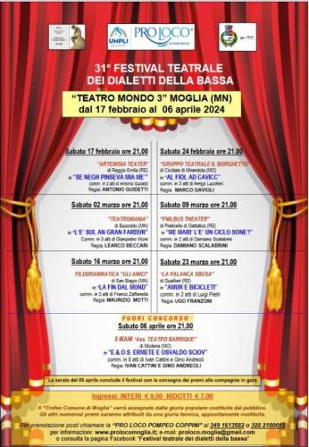 Sabato 17 febbraio la “Pro Loco Pompeo Coppini” e l’Assessorato alla Cultura del Comune di Moglia, attendono gli appassionati di teatro dialettale, locali e non, per la serata inaugurale del “Festival Teatrale dei Dialetti della Bassa”, giunto in piena salute alla 31ª edizione. La manifestazione si svolgerà ogni sabato sera (saltando il sabato pasquale) alle ore 21 dal 17 febbraio al 6 aprile 2024 nel sempre accogliente teatro “Mondo 3”.