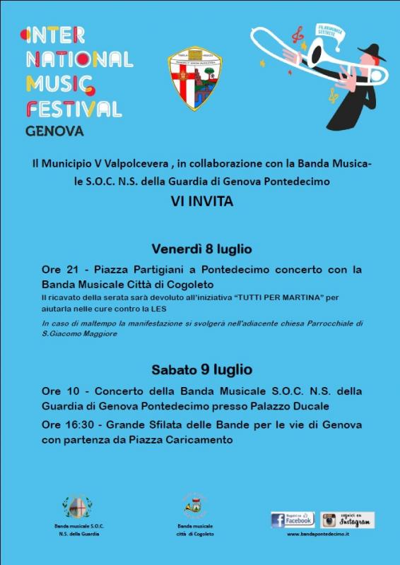 L'evento, organizzato dal Municipio V Valpolcevera in collaborazione con la Banda Musicale S.O.C. N.S. della Guardia di Genova Pontedecimo, è inserito nel programma del VII International Music Festival promosso dalla Filarmonica Sestrese che vede la partecipazione di gruppi provenienti da tutto il mondo.