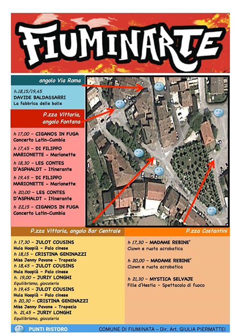 La manifestazione, in programma Domenica 16 Agosto, è promossa dall’Amministrazione comunale in collaborazione con l’associazione “Fiuminata Valle Aperta”, e gode del contributo della Regione Marche e del sostegno di sponsor locali. La direzione artistica è a cura di Giulia Piermattei, diplomatasi presso la Scuola di Circo Contemporaneo “Flic” di Torino e specializzata in acrobatica aerea.