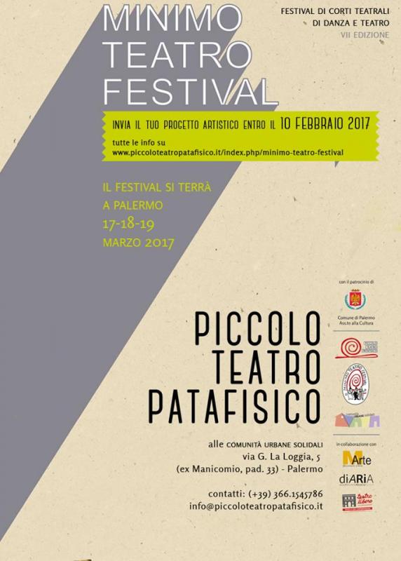 Torna anche quest'anno l'atteso appuntamento con il Minimo Teatro Festival. Il Piccolo Teatro Patafisico, in collaborazione con la compagnia M’arte, l’associazione Diaria e il Teatro Libero di Palermo, presenta la settima edizione del festival nazionale dedicato ai corti teatrali, ovvero performances dal vivo di teatro e danza della durata massima di 20 minuti, di qualsiasi genere. Sono aperte le selezioni, il bando è on line sul sito del teatro per la ricerca di registi e attori in tutta Italia che abbiano proposte creative.