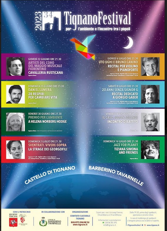 BARBERINO TAVARNELLE (Fi) - Torna a risplendere il palco del Castello di Tignano con otto serate di cultura e spettacolo (orario d’inizio 21.30) per riflettere e sensibilizzare sui temi dell’ambiente e della pace. La 34esima edizione del Tignano Festival per l’Ambiente e l’Incontro tra i Popoli gode del patrocinio della Regione Toscana e della Città Metropolitana di Firenze ed è organizzata dal Comitato Culturale Tignano in collaborazione con il Comune di Barberino Tavarnelle.