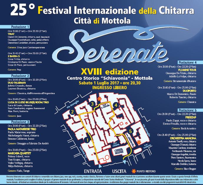 Tutta la musica del mondo in una sola sera: Mottola, sabato 1 luglio, si accende con “Serenate”, il grande evento nel centro storico che prevede concerti all’aperto che spaziano dal tango al country, dalla musica classica al reggae, dal pop al rock. Per il genere d’autore, chiamato persino un soprano che interpreterà le più belle canzoni di Fabrizio De Andrè. Questo e molto altro nella manifestazione che apre ufficialmente la XXV edizione del Festival Internazionale della Chitarra- Città di Mottola.