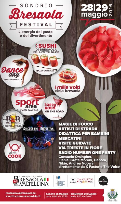 La manifestazione, promossa dal Comune di Sondrio in collaborazione con il Consorzio di tutela Bresaola della Valtellina e con l’Unione Commercio Turismo e Servizi della Provincia di Sondrio, presenta un programma ricco di eventi che prevede degustazioni, musica, show cooking, street food, mostra-mercato dei piccoli produttori locali, esibizioni sportive e menù a tema nei ristoranti convenzionati.
