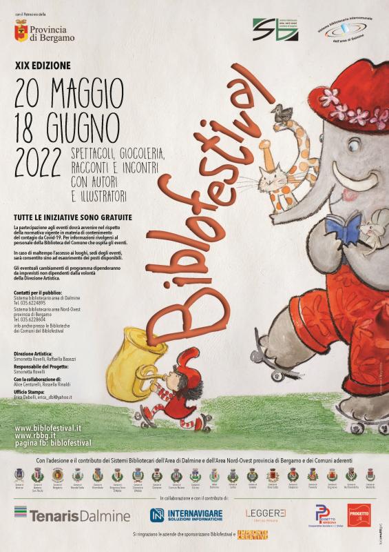 Torna Biblofestival, la manifestazione di spettacoli di strada, teatrali, narrazioni, giocoleria, incontri con autori e illustratori, dedicata ai più piccoli e alle famiglie. Dal 20 maggio al 18 giugno in cartellone più di quaranta appuntamenti, pomeridiani e serali, tutti gratuiti, che coloreranno e animeranno le strade, le piazze, i parchi e le biblioteche dei diciannove Comuni della provincia bergamasca che hanno aderito all’iniziativa organizzata dai Sistemi Bibliotecari dell’Area di Dalmine e dell’Area Nord-Ovest della provincia di Bergamo con il patrocinio della Provincia di Bergamo. La direzione artistica - Simonetta Rovelli e Raffaella Basezzi, con la collaborazione di Alice Centurelli e Rossella Rinaldi - ha costruito un ricco e variegato programma attingendo tra i migliori artisti del panorama nazionale e internazionale nel campo dell’intrattenimento dedicato all’infanzia. Ecco quindi tornare con Biblofestival lo stupore, la meraviglia, equilibrismi impossibili, storie con bizzarri personaggi, racconti in musica che sapranno coinvolgere grandi e piccini in una girandola di emozioni, divertimento e magia. “Perché Biblofestival – spiegano Gianluca Iodice, presidente del Sistema Bibliotecario Intercomunale dell’Area di Dalmine e Marzio Zirafa, presidente del Sistema Bibliotecario Intercomunale dell’Area Nord-Ovest, insieme alla direzione artistica - con la magia del racconto, la semplicità di esilaranti situazioni inaspettate, non smette di meravigliare tutto il pubblico di bambini e bambine, di mamme e papà, nonni e nonne che vorranno seguirci e, siamo sicuri, saranno numerosi. Perché Biblofestival vuole mettere al centro il mondo dell’infanzia che è anche il mondo della fantasia, della creatività e della pura emozione. E per tutto questo non c’è età.”