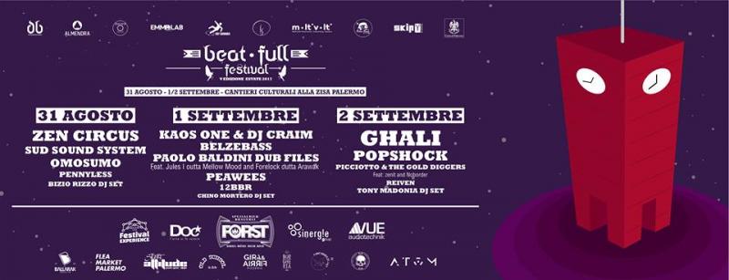 Miscelare la musica underground che arriva da oltre lo stretto con quella locale siciliana è l'ambizione che da sempre ha il Beat Full Festival, giunto quest'anno alla sua quinta edizione con tante novità. Quest’anno il Beat Full, in continua crescita con migliaia di partecipanti ogni anno, è in programma da Giovedì 31 Agosto a Sabato 2 Settembre ai Cantieri Culturali della Zisa di Palermo con una line up degna dei migliori festival Italiani. Ogni giorno i cancelli verranno aperti alle 18 e il pubblico potrà godere di un continuo susseguirsi di musica, tra dj set, band locali e vari headliner.