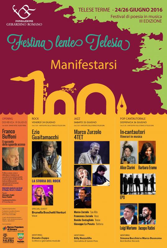 Il festival di poesia in musica Festina Lente Telesia 2016 della Fondazione Gerardino Romano, giunto alla sua terza edizione, torna il 24, 25 e 26 giugno 2016 presso lo spazio delle Terme di Telese. Il tema è “Manifestarsi”, in riferimento ad una rivelazione del sé come momento culminante di un percorso evolutivo che conduce ad una rinascita consapevole.