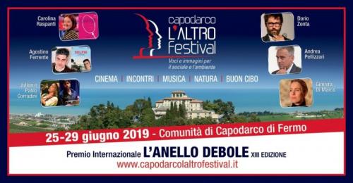 Il regista Agostino Ferrente, l’attrice Carolina Raspanti, un workshop sul futuro della radio “sociale”, la “Notte dei corti”, il concerto di Ginevra di Marco: è ricco e di alta qualità il cartellone dell’edizione 2019 del Capodarco L’Altro Festival, che svela oggi il programma completo. L’appuntamento dal 25 al 29 Giugno è come ogni anno alla terrazza sul mare della Comunità di Capodarco di Fermo, che si trasforma in un suggestivo cinema all'aperto.