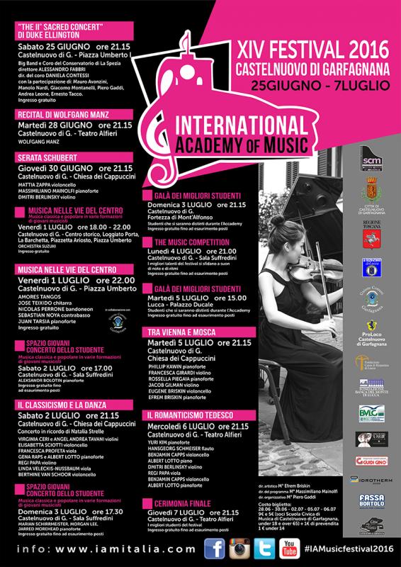 L’International Academy of Music Festival, la manifestazione che dal 2003 porta nella Valle del Serchio alcuni tra i migliori interpreti di musica da camera della scena internazionale, è giunta quest'anno alla 14esima edizione. L’evento, che beneficia del sostegno economico e istituzionale della Regione Toscana e rientra nel progetto regionale “La Toscana dei Festival”, richiama ogni anno circa 200 musicisti provenienti dai cinque continenti ad animare Castelnuovo, la Valle del Serchio e Lucca, grazie all’organizzazione della Scuola Civica di Musica di Castelnuovo di Garfagnana e quest'anno vede tra gli ospiti nomi come Dmitri Berlinsky, Regi Papa, Benjamin Capps, Gena Raps, Yuri Kim e altri ancora.