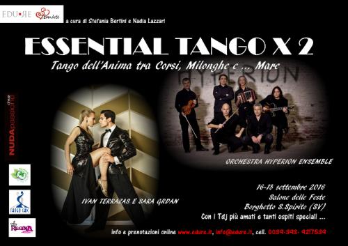 A grande richiesta, dopo il successo del 2014, torna a Borghetto a settembre 2016 “Essential Tango X 2”, in una versione completamente nuova che vi stupirà per gli artisti e ospiti internazionali che vi faranno ballare senza sosta con freschezza e allegria.
