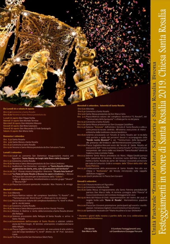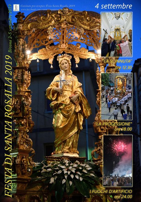 La città per 4 giorni rimane sospesa, come catturata da una magia di suoni, sapori e odori che annunciano e segnano la festa. Il programma è ricco di appuntamenti religiosi molto suggestivi: dalla processione con le sacre reliquie della Santa del 3 settembre, alla imperdibile scinnuta della Vara dalla Nicchia centrale della chiesa dedicata alla santa – 4 settembre ore 12.00 -; dalla processione del simulacro portato a spalla per le vie del paese da portatori devoti -4 settembre ore 18.00 - alla ricollocazione della vara nel luogo di custodia. Di particolare interesse risulta la celebrazione eucaristica che si svolge nella piazza principale del paese e che quest’anno sarà affidata a monsignor Filippo Sarullo, parroco della Cattedrale di Palermo, in virtuale gemellaggio con la città metropolitana patrocinata da Santa Rosalia.